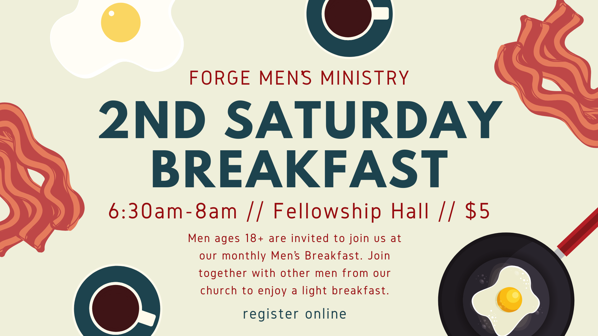 Men ages 18+ are invited to join us at our monthly Men’s Breakfast. Join together with other men from our church to enjoy a light breakfast.