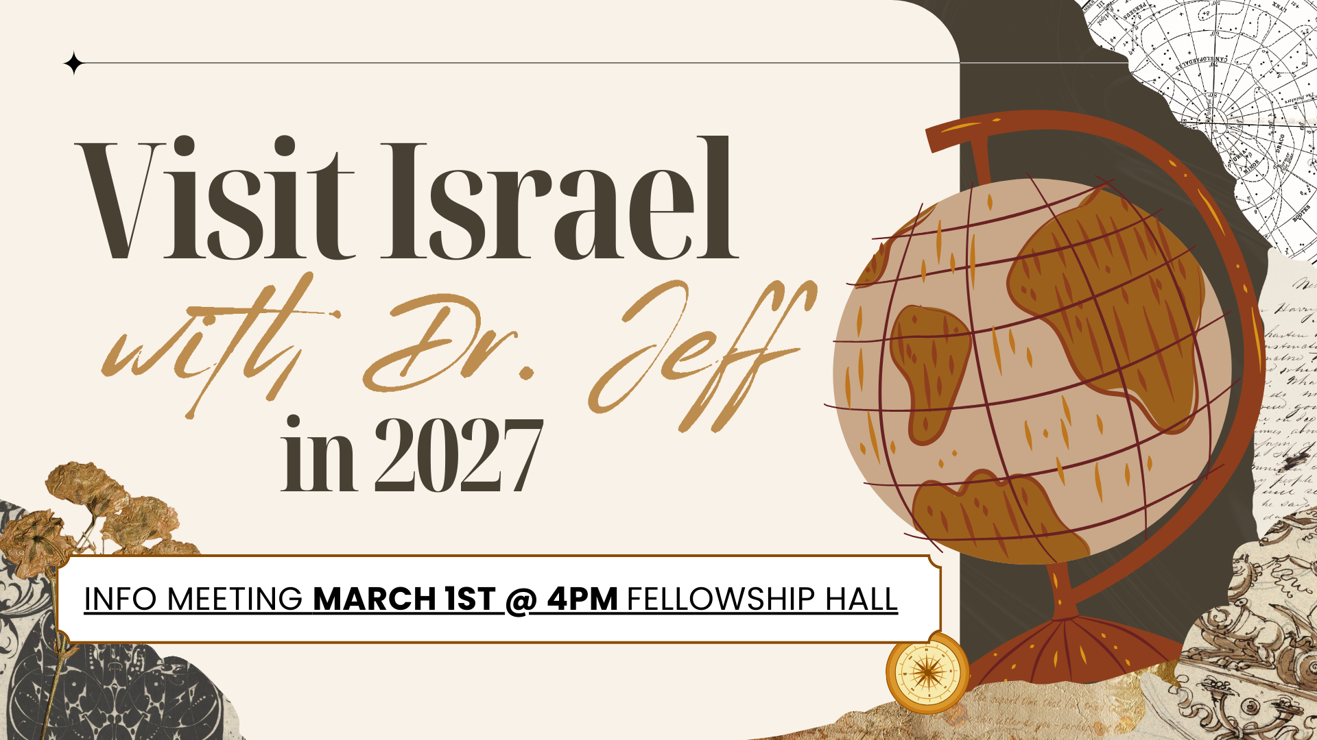 Dr. Jeff is going to Israel in March 2027. If you're interested in learning more, join us for a information meeting on March 1st at 4pm.