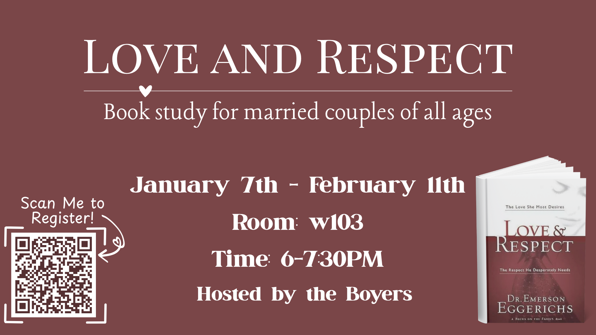 Calling all married couples! Join us for a book study of Love and Respect by Dr. Emerson Eggerichs. This study will be a 10-week study for married couples of all ages.