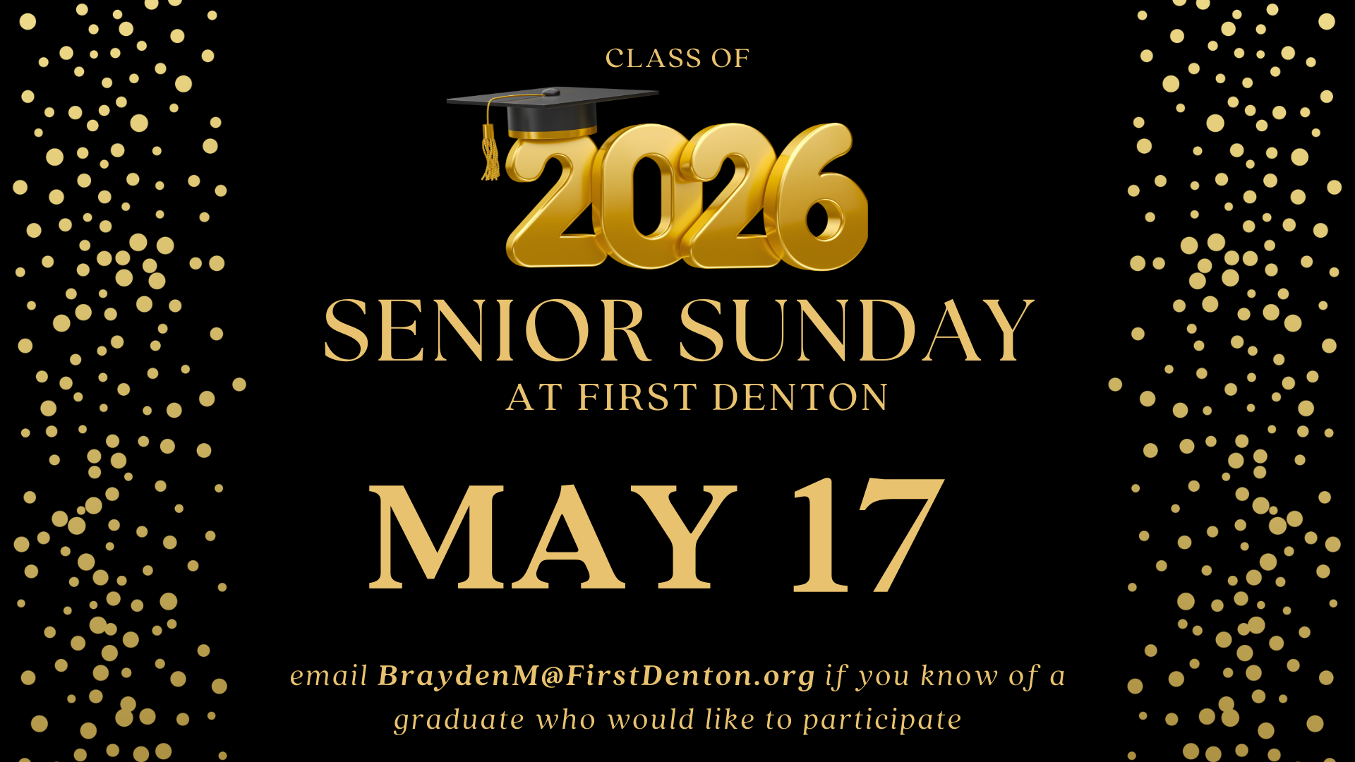 We will be celebrating our 2026 Seniors during the worship services on Senior Sunday. If you would like your student to be involved with this celebration, email Brayden Marion at braydenm@firstdenton.org.